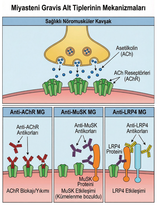MG’yi alt tiplere ayırmak, patogenez, tanı ve tedaviyi anlamada kolaylık sağlar. Klasik MG tipi, erken başlangıçlı, jeneralize, anti-AChR pozitif ve timomasız hastalardır.